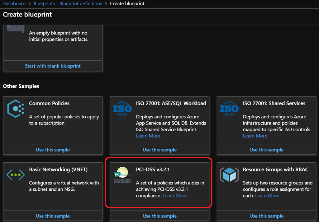 Well a new Blueprint sample has just been added (PCI-DSS v3.2.1) to help you setting up your Azure governance to match the requirements for Payment Card Industry Data Security Standards compliance.