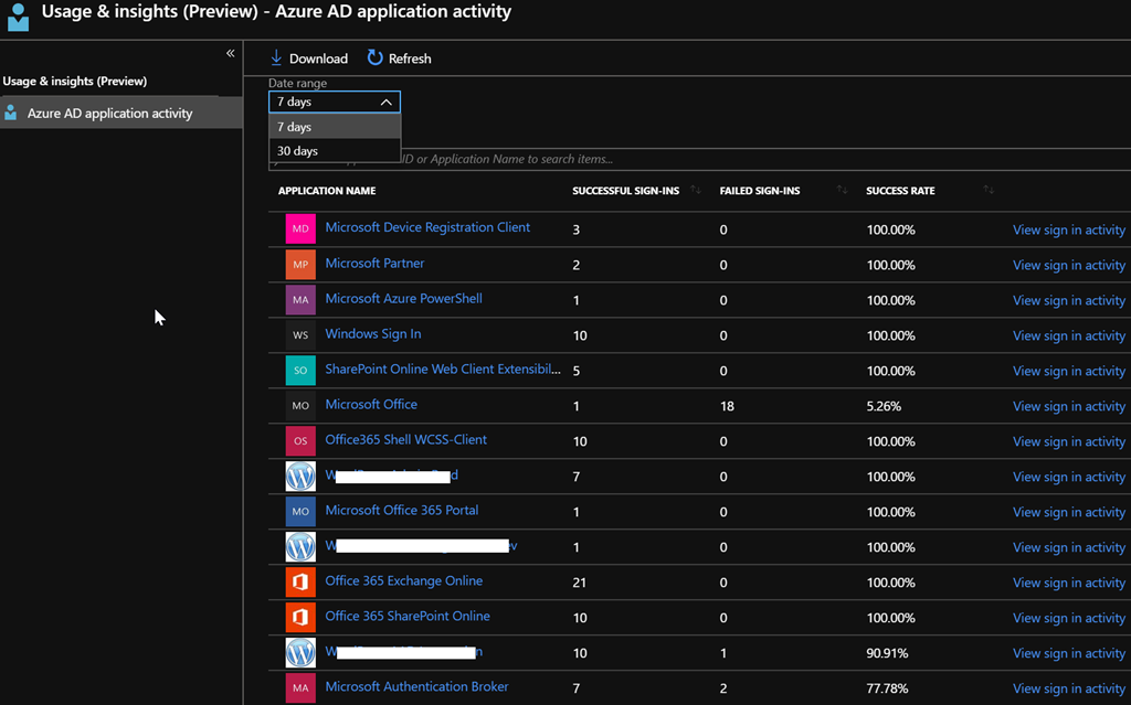 For each application you have the number of successful and failed sign-ins. You can then go to a specific application details by clicking on the application name, this will redirect you to the application configuration blades.