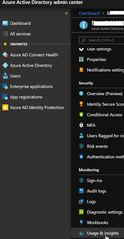 To start using this ‘reporting’ feature, logon to your Azure AD (https://aad.portal.azure.com) or your Azure (https://portal.azure.com/) portal and reach out the Azure Active Directory\Monitoring\Usage & Insights blade