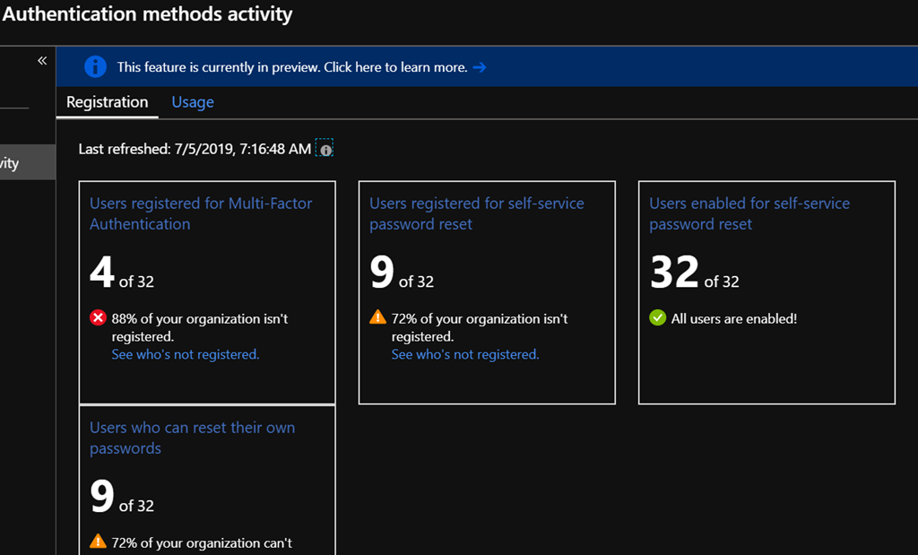 You have reports on the number of users registered for MFA/registered for SSRP, registration failures by using the Registration tab