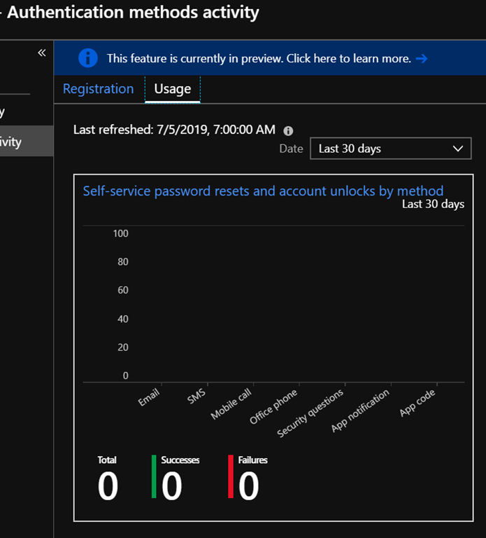 Switching to the Usage tab you will get report related to SSPR and unlock account methods