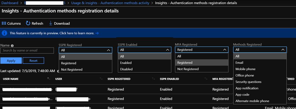 After having introduced in preview the Usage and Insights for Azure AD Application (see https://t.co/0TLTScRjWI), you can now also have the same insights for the authentication methods used to authenticate against Azure AD.
