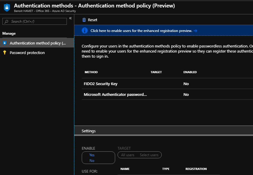 To start using the new password-less authentication methods, logon to your Azure AD portal (https://aad.portal.azure.com/) or Azure portal (https://portal.azure.com) and reach out the Authentication methods blade