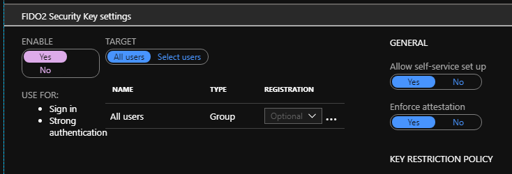 From there you can enable FIDO2 Security key and/or Microsoft Authenticator authentication methods to either all or selected users