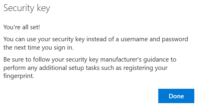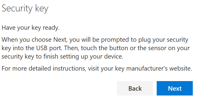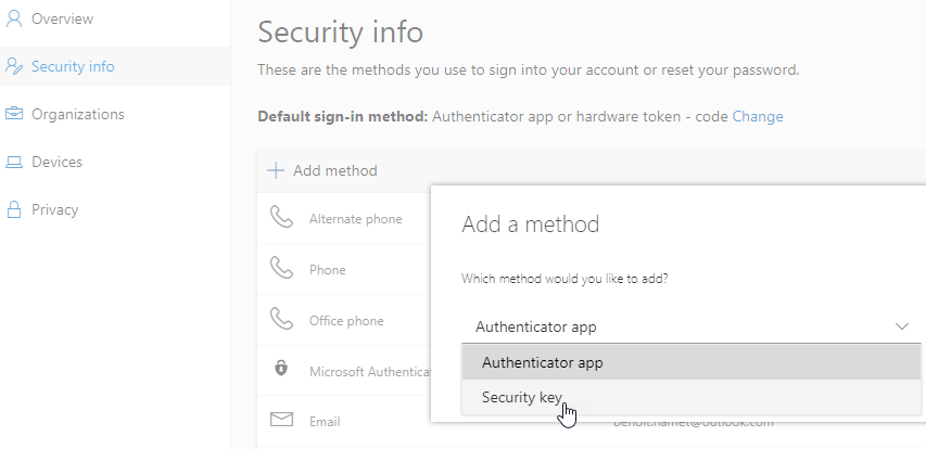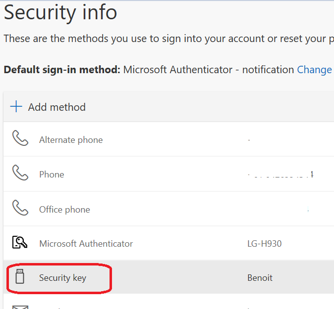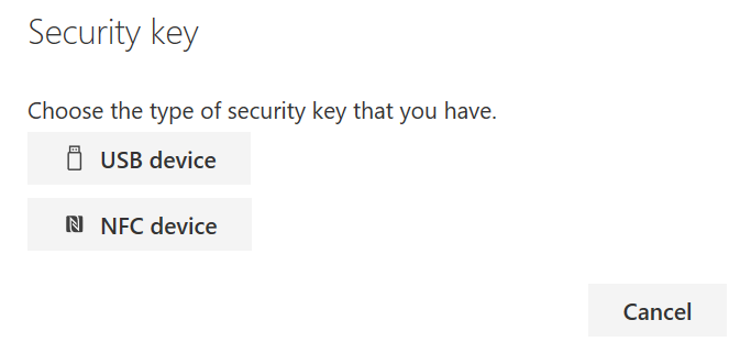 Once enabled your users will then be able to register their FIDO2 key and/or Microsoft Authenticator app by accessing their self service portal (https://mysignins.microsoft.com) by accessing the Security info section and then Add method to select Security Key and the key tyep 9USB or NFC