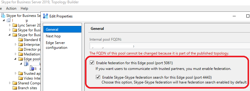 If you are not sure or want to enable the federation, check the properties of your Edge deployment using the Skype for Business Topology builder to confirm/update the federation settings as per the below screenshot; both Enable federation for this Edge pool and Enable Skype-Skype federation search are enabled