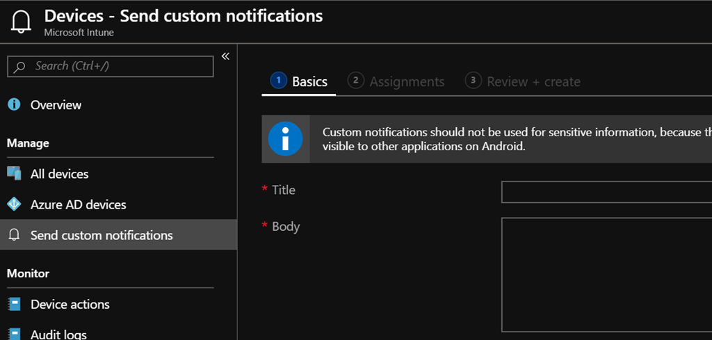Then reach the Send custom notifications blade and set your notification, choose the group(s) – if the group contains both users and devices, only users will be targeted – to notify