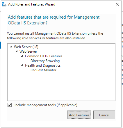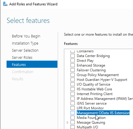 - If you use Server Manager enable the Management OData IIS Extension (and additional required features)