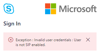 If the account is not Skype enabled, the error “Exception : Invalid user credentials : User is not SIP enabled.” is shown