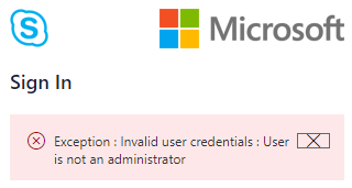 If the account is hosted on Skype for Business Online, the error “Exception : Invalid user credentials : User is not an administrator” is shown (while of course the account I used is a Skype for Business administrator