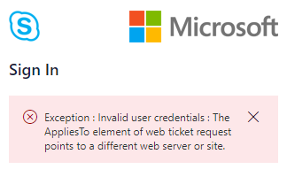 Exception : Invalid user credentials : The AppliesTo element of web ticket request points to a different web server or site.”