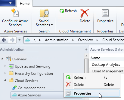 To enable this new discovery, open your SCCM administration console and reach out the Administration\Cloud Services\Azure Services workspace and edit your Cloud Management configuration