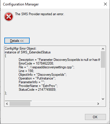 at Microsoft.ConfigurationManagement.AdminConsole.CloudServicesManagement.CloudManagementAction.RunFullDiscovery(Object sender, ScopeNode scopeNode, ActionDescription action, IResultObject selectedResultObject, PropertyDataUpdated dataUpdatedDelegate, Status status)——————————-