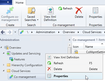 From the SCCM administration console, reach the Administration\Cloud Services\Co-management workspace and edit your co-management settings