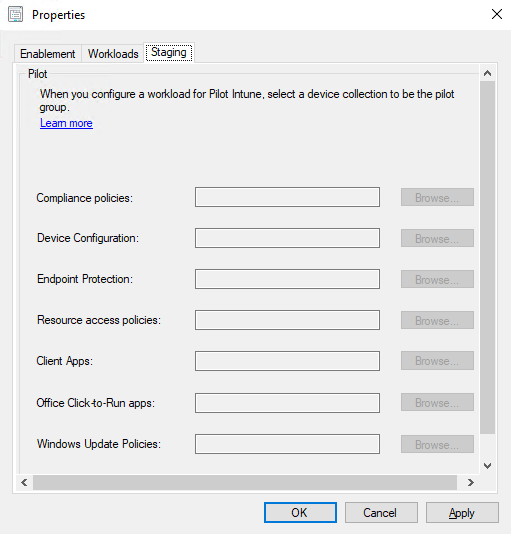 Then reach the Staging tab and define the collection you want to use for pilot the specific workload