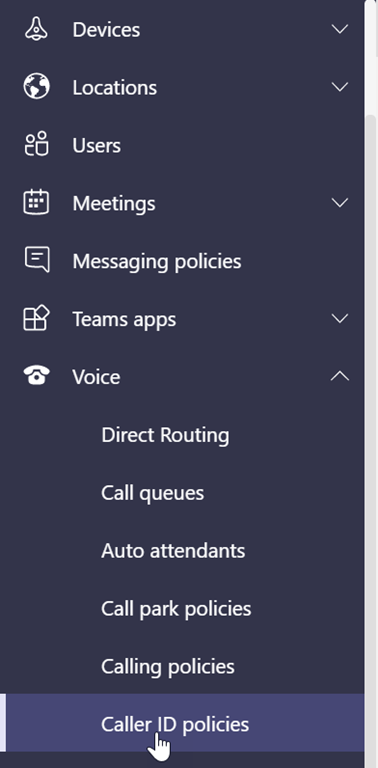 The Caller ID policy blade is accessible below the Voice\Caller ID policies