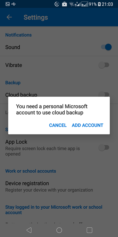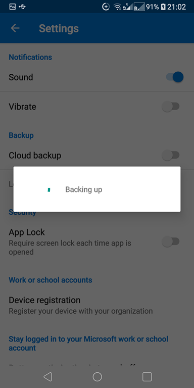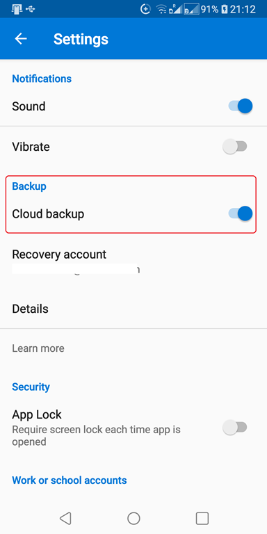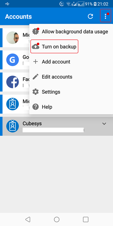 To enable the backup capability, just access the Options menu (the 3 dot shown at the top right of the application) and choose to Turn on backup – or access the Settings and enable the Cloud Backup feature.