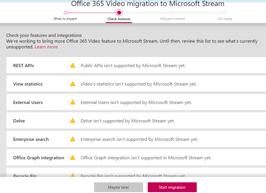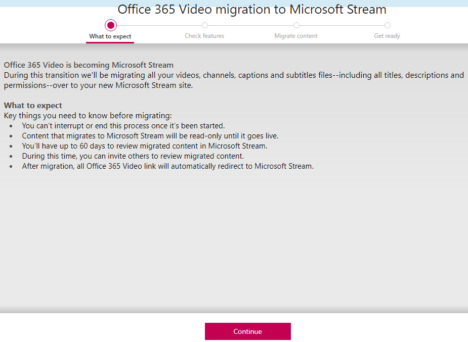 Then you just have to follow the instructions to start migrating from Office 365 Video to Microsoft Stream to review supported/unsupported features and integration