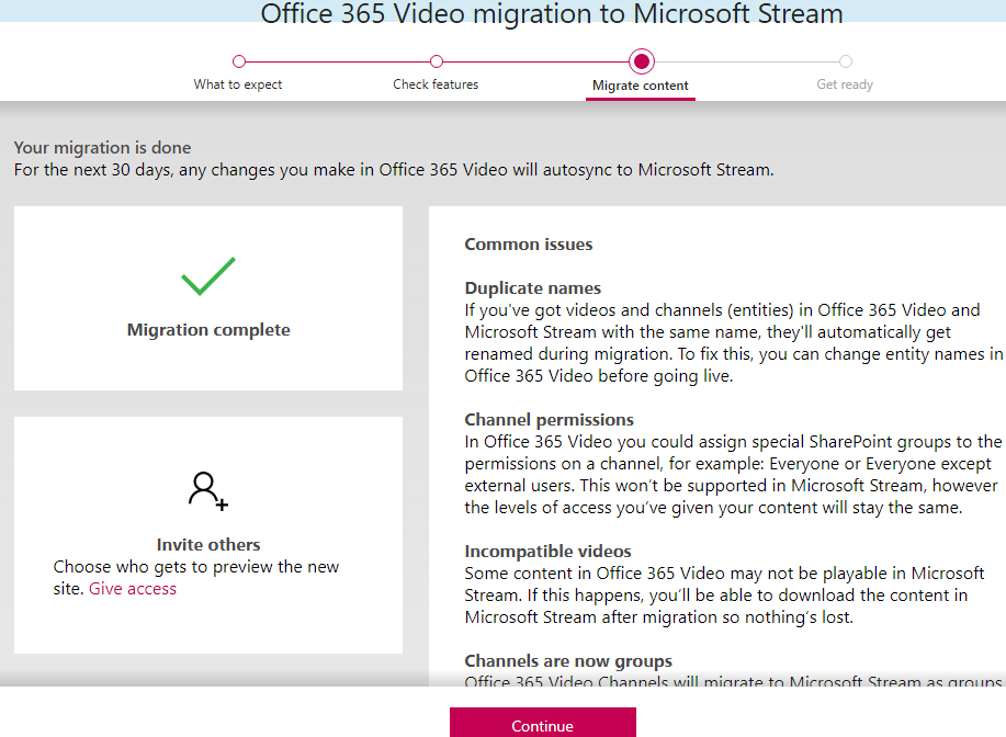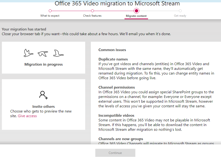 While the migration process is in progress, you will see a banner in Office 365 Video telling you a migration is currently running