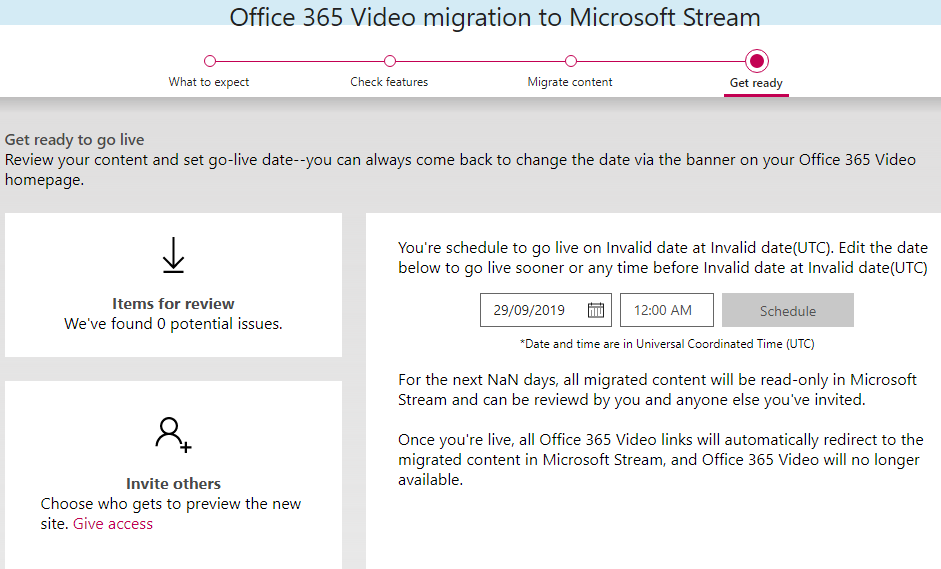 Once you have validated the migrated content, you can set a go live date which will complete the migration process and will make all migrated content available as it used to be in Office 365 Video.