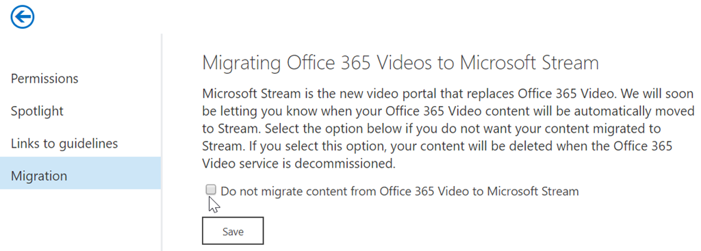 If you do not wish to migrate your content to Microsoft Stream, you can request to not automatically migrate Office 365 Video by accessing the Portal Settings\Migration option to enable the ‘Do not migrate content from Office 365 Video’ option