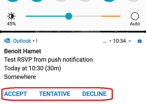 The Outlook mobile application (iOS: https://apps.apple.com/app/microsoft-outlook/id951937596 – Android: https://play.google.com/store/apps/details?id=com.microsoft.office.outlook) has been updated and allows you to reply to meeting request directly from the push notification.
