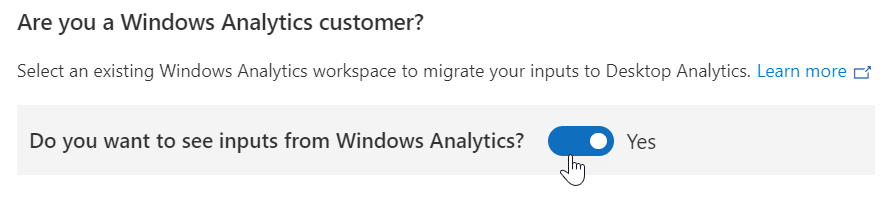 When setting up your new Desktop Analytics, don’t forget to enable the option “Do you want to see inputs from Windows Analytics?” if you want to get your existing data from Windows Analytics to be migrated