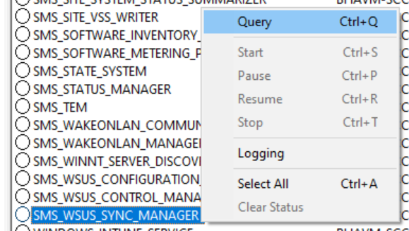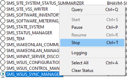 1. Shutdown the SMS_WSUS_SYNC_MANAGER using the Configuration Manager Service Manager tool from your SCCM\Monitoring workspace