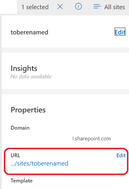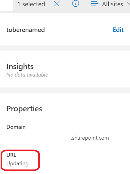 NOTE if you have enabled a retention policy on SharePoint sites, you will have to exclude (at least temporarily) the site you want to rename, otherwise you will get the error, with the Edit button greyed out