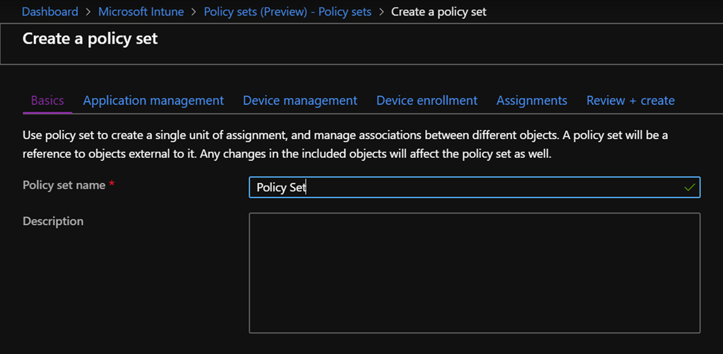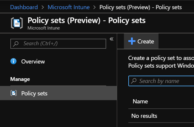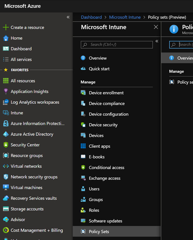 To start using Intune Policy Sets, logon to your Azure portal (https://portal.azure.com) and reach out the Intune\Policy Sets configuration blade