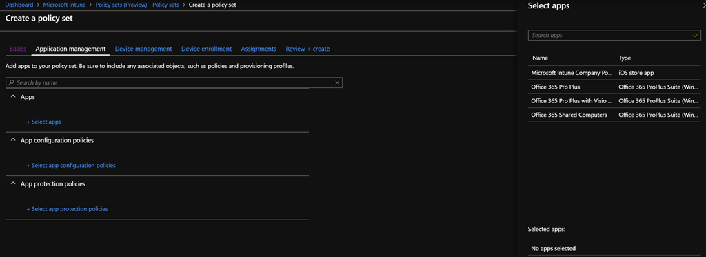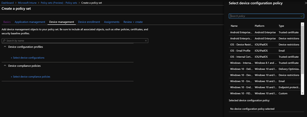 - Select the device enrolment profile(s) – optional – on which the policy set will apply to