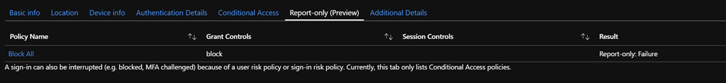 The result of this Report Only is then available through the Sign In blade (available below the Monitoring section) when selecting a user account on which the policy should have been applied to