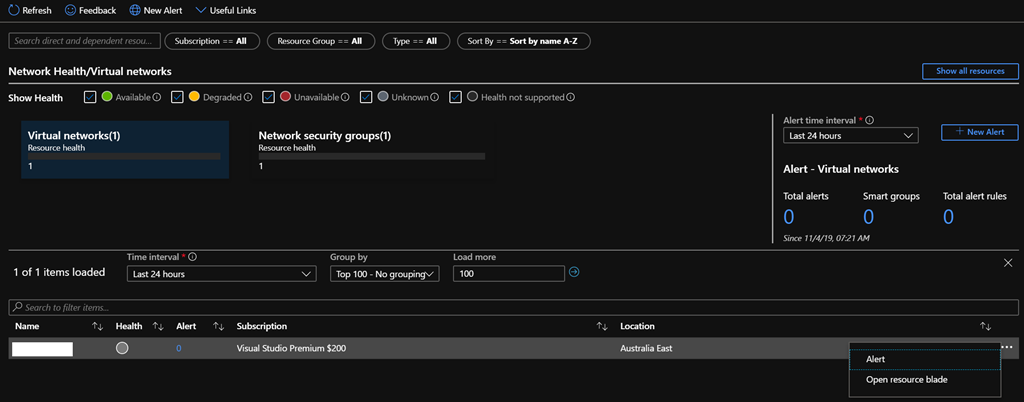 There you will have all network related (network security groups, virtual networks…) listed with their status (available/healthy, degraded or unavailable/unhealthy) with a summary of network related alerts