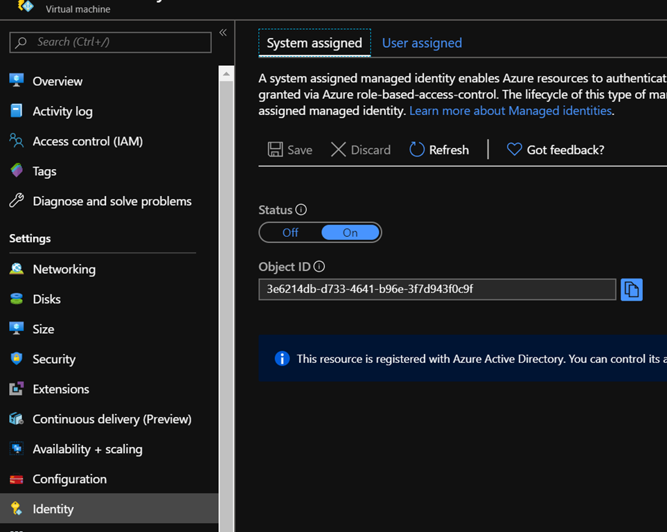 You can either use the Az command above or from the portal by accessing the Identity blade to turn on the System assigned identity