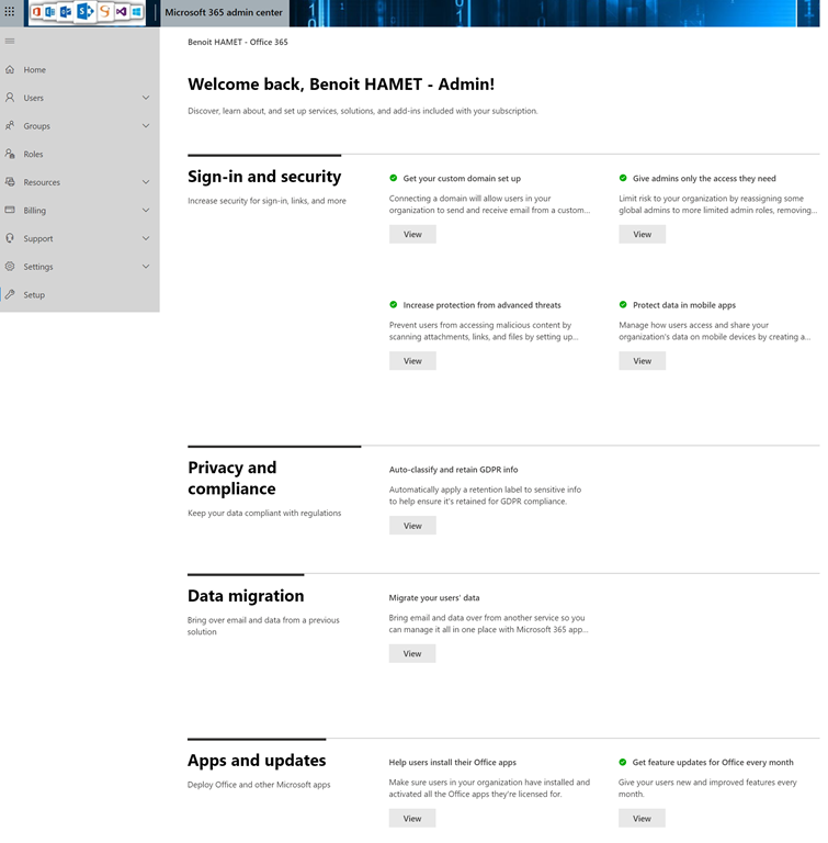 the new Setup menu is now a single configuration blade showing up all setup tasks and their status which then allows you to navigate through the important sections (Sign-In and Security, Privacy and Compliance, Data Migration…) to ensure you are setting up/have setup your Office 365 tenant