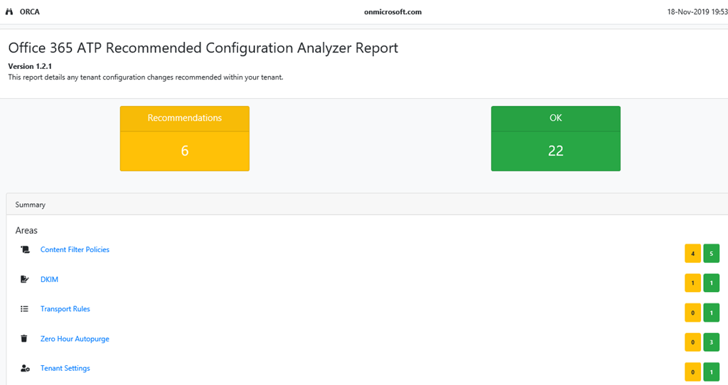 To help you in this process, Microsoft has released a new PowerShell module to generate an Office 365 Recommended Configuration Analyzer (aka ORCA) for ATP.