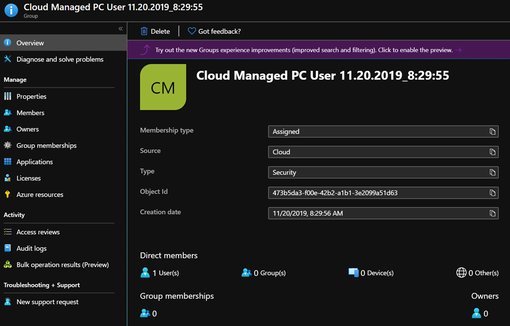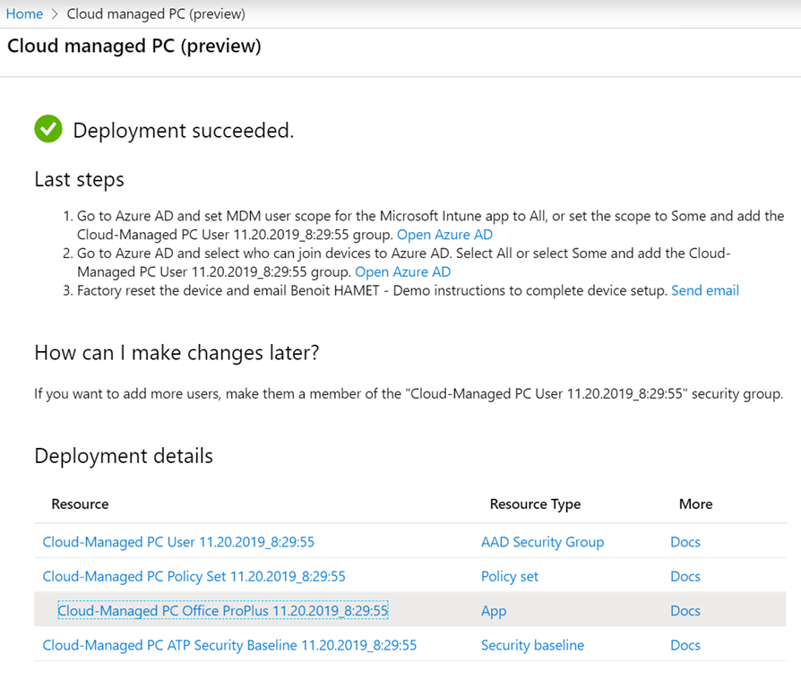 Cloud Managed PC User <time stamp>, is created with the selected test user account as member; you can use this group to add/remove user accounts for your testing; along with an Intune policy set called Cloud-Managed PC Policy Set <time stamp> and a security baseline