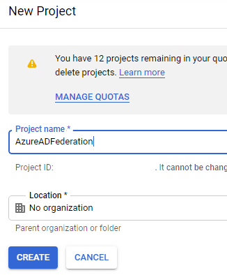 Create a new project and name it; optionally if you already have an organization configured you can also define it