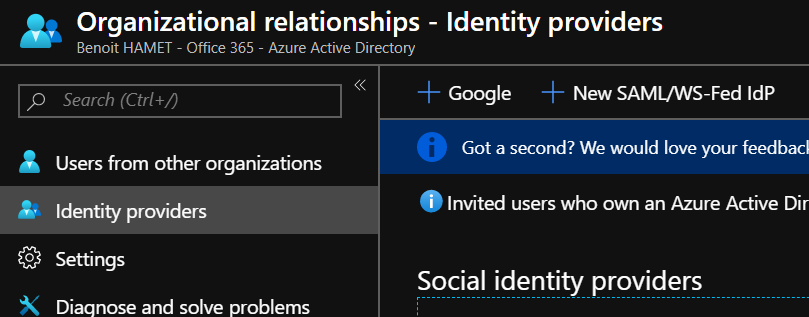 Then you can logon to your Azure portal (https://portal.azure.com/) or Azure AD Portal (https://aad.portal.azure.com/) to enable Google ID federation for your Azure AD and reach the Organizational relationship