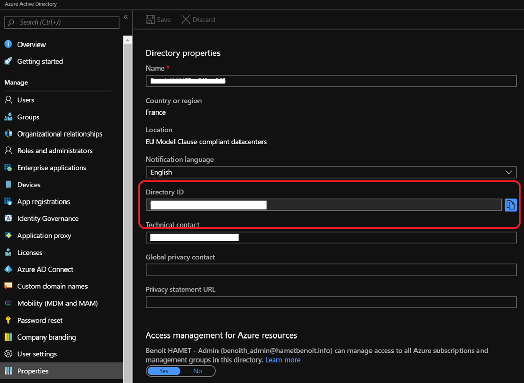 To do so, you need to get your Azure AD tenant ID (aka Directory ID), you can get it from the Properties blade of your Azure AD