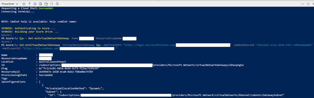 Set-AzVirtualNetworkGateway -VirtualNetworkGateway $gw –AadTenantUri “https://login.microsoftonline.com/<your Azure AD ID>” -AadAudienceId “41b23e61-6c1e-4545-b367-cd054e0ed4b4” -AadIssuerUri “https://sts.windows.net/<your Azure AD ID>/”