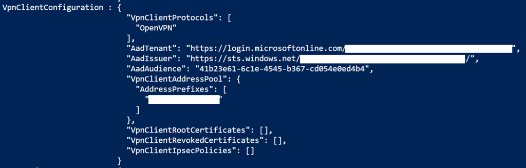 Once completed, you should see in the VpnClientConfiguration your Azure AD tenant and issue details