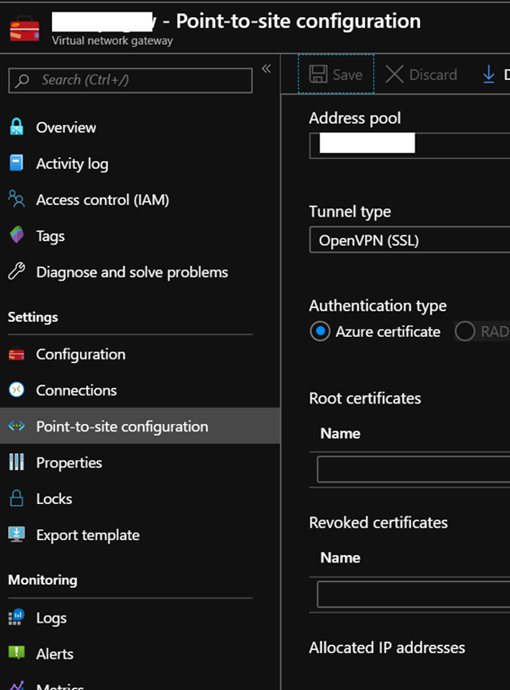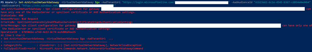 NOTE the Point to Site VPN connection must be configured with OpenVPN and no root certificate, otherwise you will ended with the error “Set-AzVirtualNetworkGateway : Vpn client configuration for gateway <removed> can have only one of the RadiusServer or vpnclient certificate or AAD Authentication settings.”