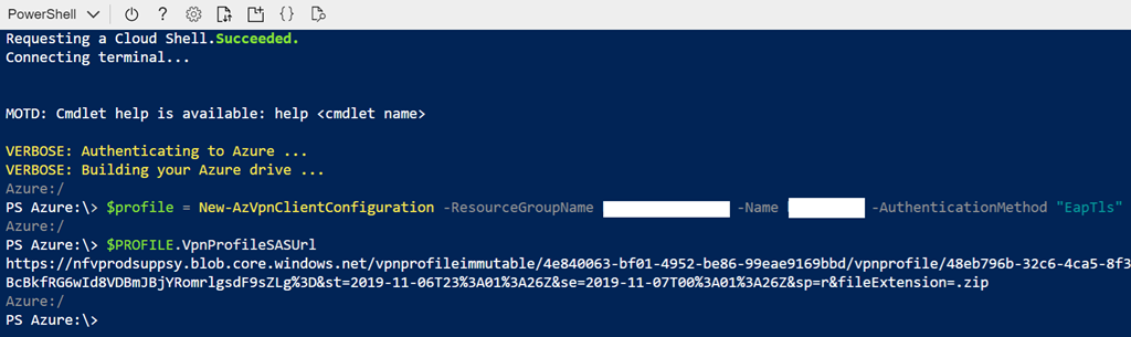 $profile = New-AzVpnClientConfiguration -ResourceGroupName <your resource group> -Name <your VPN Gateway> -AuthenticationMethod “EapTls”