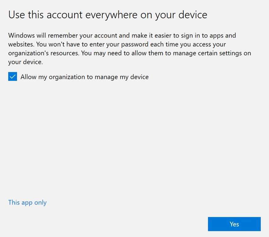 You may be prompted to let your organization to manage the device (if your device is not Azure AD registered and/or already managed by Intune)