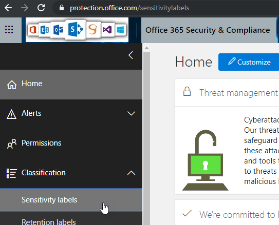 Then you need to connect to your Office 365 Compliance Center (https://protection.office.com/) to create/edit your sensitivity label (available in the Classification section), if required