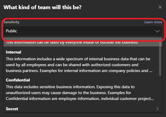 Once done, you can now define the Teams sensitivity which then will apply the corresponding sensitivity label.