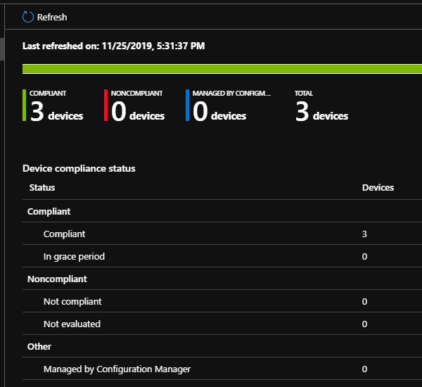 Once completed, you will first get an overall overview of the compliance state and if some devices are managed by SCCM (this seems to have some trouble as I have devices in co-management, but have report of no devices are managed by SCCM)