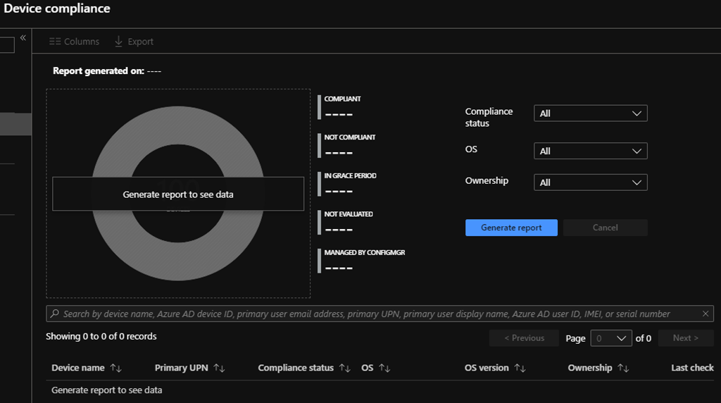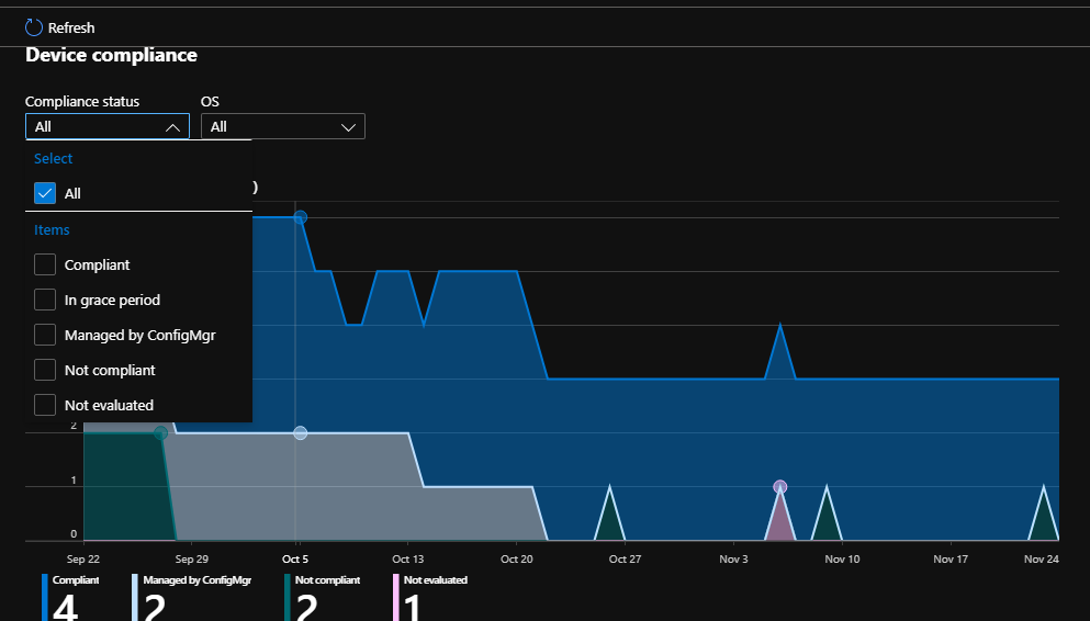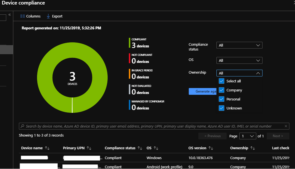 From the left side, you can then browse to a more details compliance state (Device Compliance) report from which you can then do some filtering