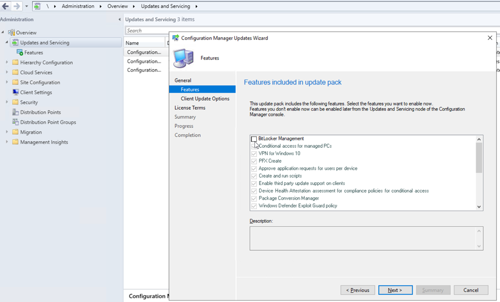 - Bitlocker Management (MBAM) – Configuration Manager now provides the following management capabilities for BitLocker Drive Encryption (you can enable it when installing the update – see below)